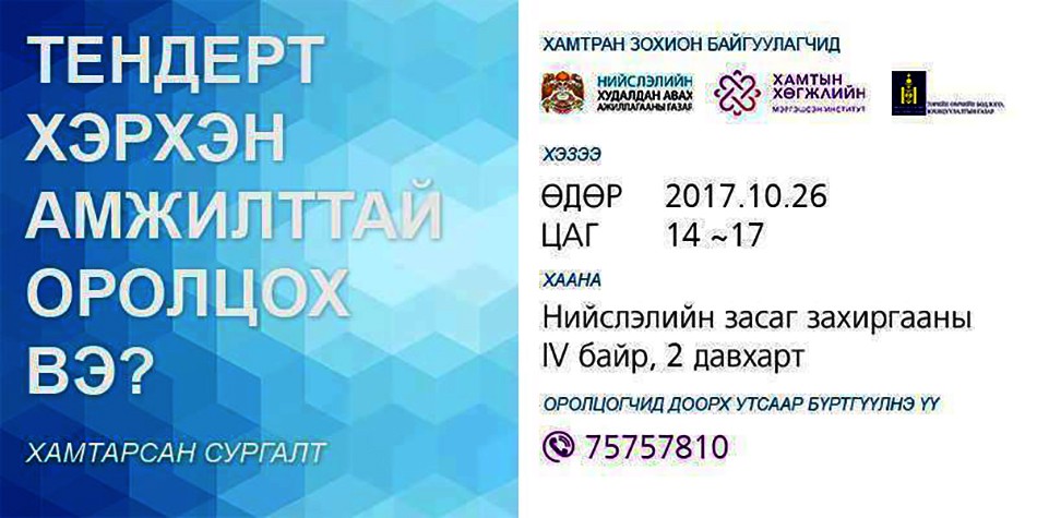 “ТЕНДЕРТ ХЭРХЭН АМЖИЛТТАЙ ОРОЛЦОХ ВЭ?” сэдэвт, үнэ төлбөргүй сургалтад аж ахуйн нэгжүүдийг урьж байна