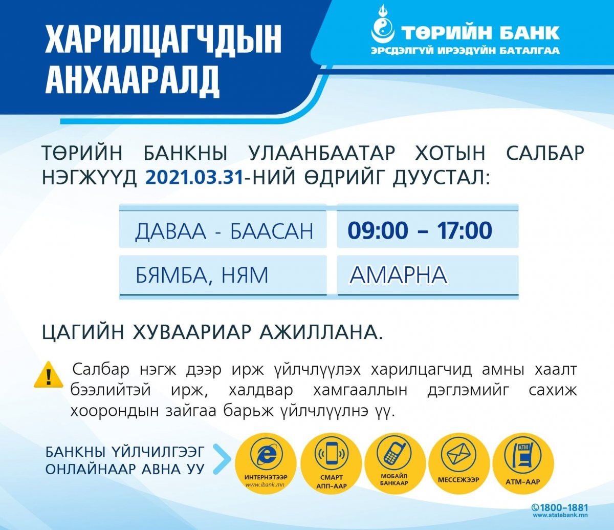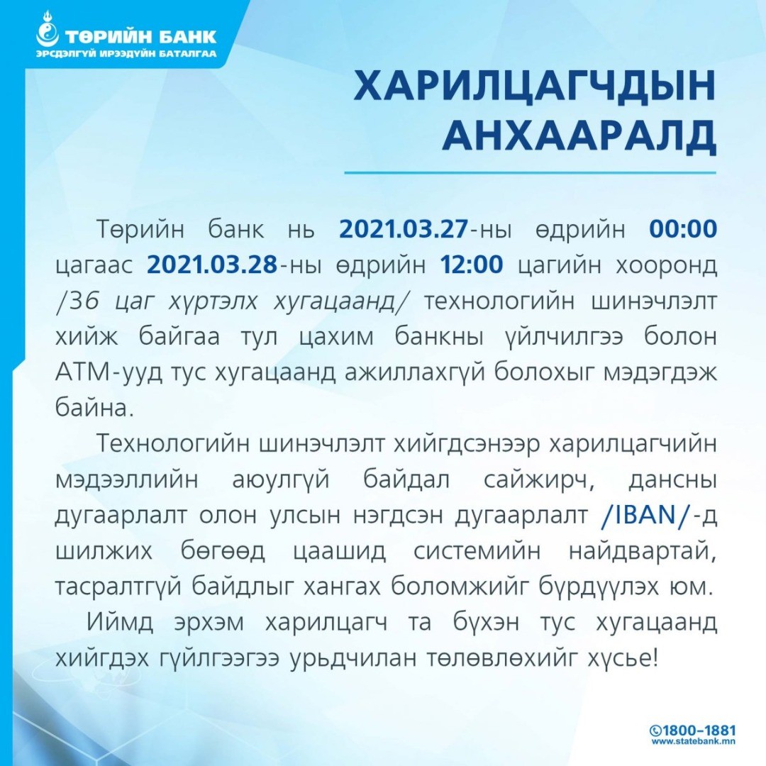 Төрийн банкны бүх гүйлгээ 03-р сарын 27-ны 00:00 цагаас 28-ны 12:00 цаг хүртэл түр зогсоно