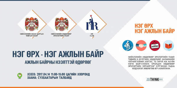 Нийслэлийн Засаг даргын тамгын газар, нийслэлийн Хөдөлмөр эрхлэлтийн газар, “Эйч ар” клуб хамтран энэ сарын 14-ний өдөр Жанжин Д.Сүхбаатарын талбайд “Нэг өрх-нэг ажлын байр” ажлын байрны нээлттэй өдөрлөгийг зохион байгуулах гэж байна.