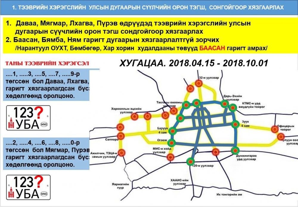 Жич: Дэд бүтцийн бүтээн байгуулалтын ажлын үеэр замын түгжрэлийг бууруулахын тулд Нийслэл болон Замын цагдаагийн алба хамтран дугаарын хязгаарлалт хийх саналыг мэргэжлийн байгууллагуудын хийсэн судалгааг үндэслэн гаргасан болно.