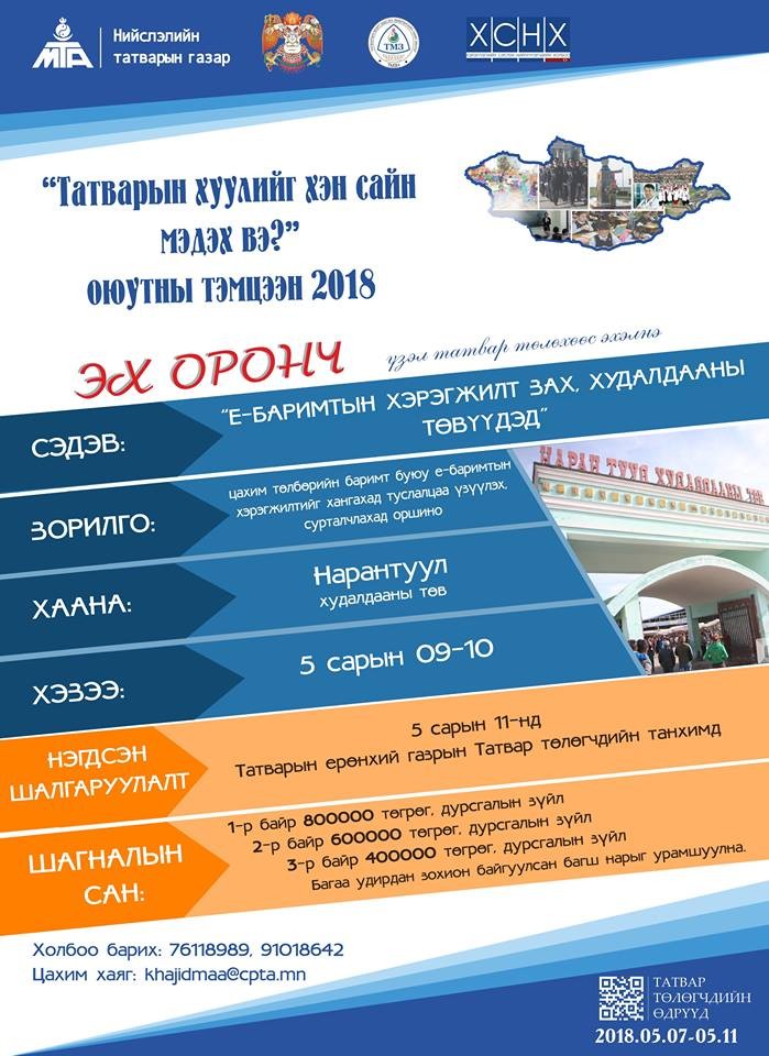 “Татвар төлөгчдийн татвараа өөрөө тодорхойлон үнэн зөв төлөх нийгмийн сэтгэлгээг төлөвшүүлэх” ажлын хүрээнд “Эх оронч үзэл татвар төлөхөөс эхэлнэ” уриан дор зохион байгуулагдаж байгаа энэхүү тэмцээнд: