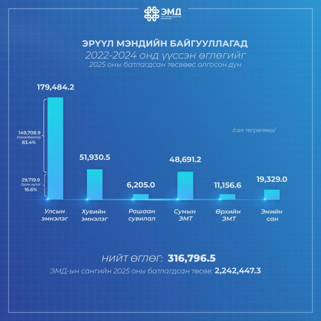 Эрүүл мэндийн даатгалын ерөнхий газар өнөөдрийн байдлаар энэ оны эхний хагас жилд эмнэлгүүдэд нийт 1 их наяд 250 тэрбум төгрөгийн санхүүжилт олгожээ.